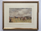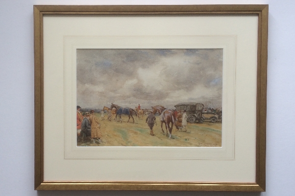 Thoroughbred horses making their way to the start of the Morperth point-to-point at Linden Hall, spectators and owners watching on, complete with a wonderful charabanc. Signed and dated 30.3.22, lower right.
