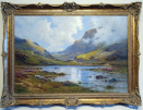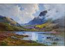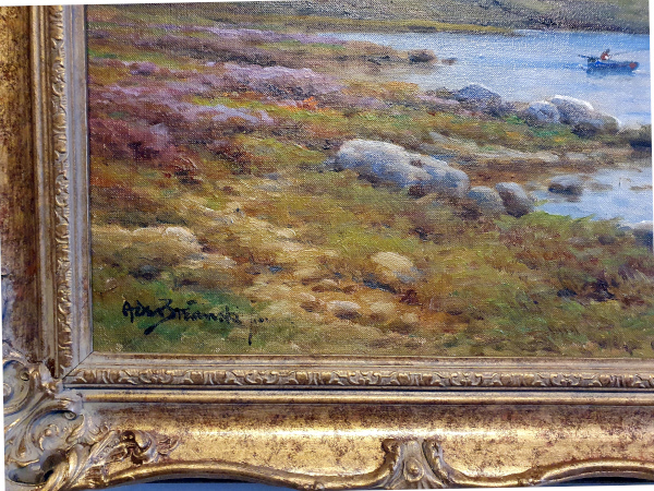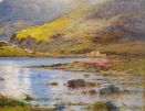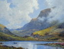 August in Kerry, the heather in flower, the sky bright blue, wind whisking clouds inland and Alfred de Breanski Jnr on holiday painting the mountain pass between the MacGillicuddy Reeks and Purple Mountain ranges. Lovely, colours very much Kerry. Signed lower left and inscribed verso.