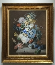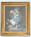 Fine, and rare, still-life in watercolours by this German artist. Beautifully painted vase of flowers with peaches and plums on a stone ledge together with insects - how many can you spot? Some age wear on close examination including a small crease in top right hand corner. Signed and dated, lower right.