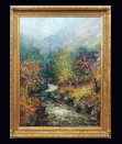 A large, colourful and fabulous impressionistic Slater oil of a river tumbling down a wooded Scottish glen, mist in the mountains beyond. The paint is thick, the range of colours employed wide, and we imagine Slater was in fine spirits when he painted this. Signed lower left.