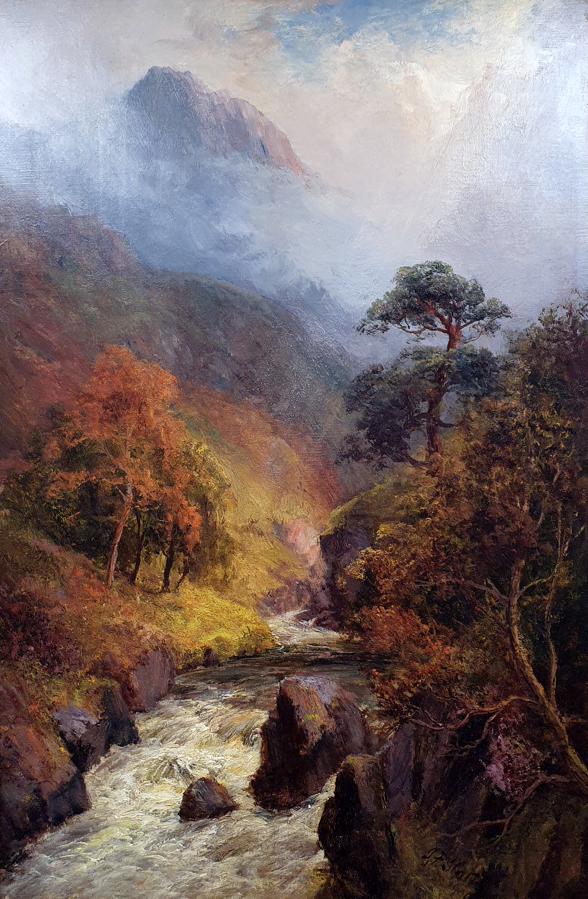 Early autumn in a Scottish glen, sun rays pierce the cloud and mist that curls around a cold granite mountain peak to illuminate stream-side birch trees. A fine example of Slater's Highland landscapes: skillfully painted with a wide range of both brush strokes and colours. Signed, lower right.
