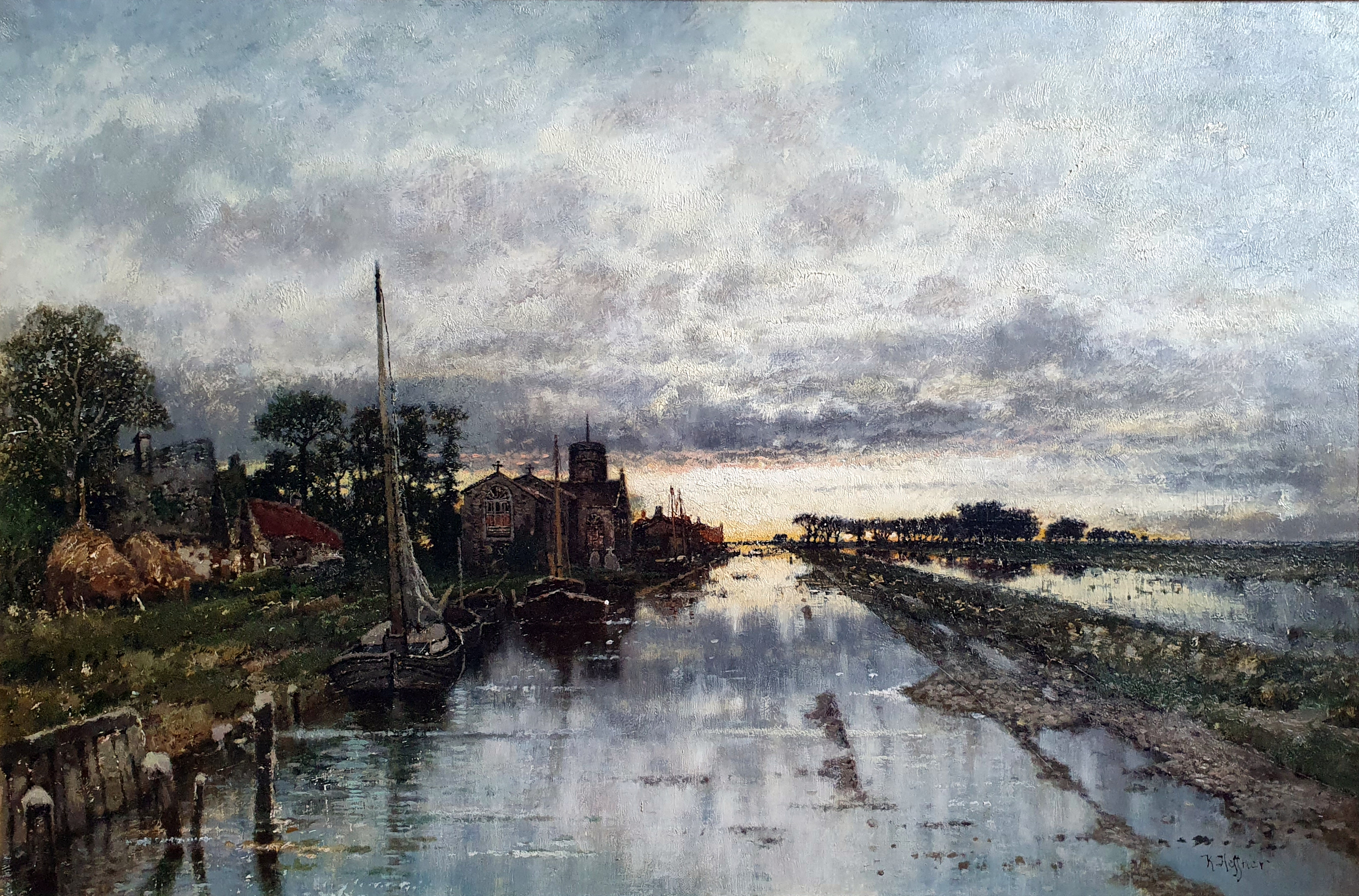 Superb fluvial Norfolk Broads landscape by Professor Karl Heffner in excellent original condition and housed in a fine William Rodman & Co. (Belfast) frame. Typical of Heffner’s impressionist style and of his favourite theme – the alliance of land and water, rivers, showery skies and flooded marshes or meadows. Lovely depiction of light and shadows on the water below a big, clouded, sky as the sun sets on the horizon. The medieval church with its round, knapped flint, tower typical of Norfolk, which has more medieval parish churches than any other county. Signed, lower right.